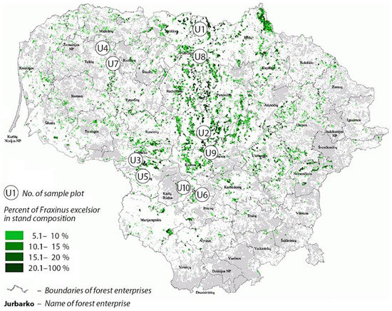 Map of Lithuania showing the distribution of Fraxinus excelsior forest stands (in green), and the position of sampling sites (U1–U10).