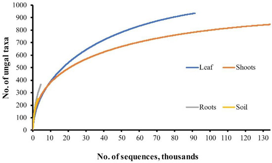 Rarefaction analysis of leaf, shoot, root, and the soil samples revealed that rarefaction curves did not reach the asymptote (Figure 2).