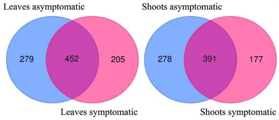 Among fungal taxa that were found in leaf samples, 279 (29.8%) were exclusively found in asymptomatic leaves, as well as 205 (21.9%) in symptomatic leaves, while 452 (48.3%) fungal taxa were common to both categories of leaf samples (Figure 3).