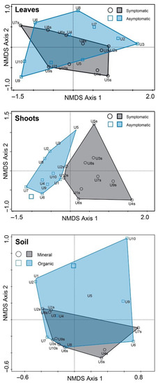 Nonmetric multidimensional scaling of fungal communities demonstrated that fungal communities in shoots were largely separated and differed significantly between symptomatic and asymptomatic samples (p < 0.002), yet they intermixed between asymptomatic and symptomatic samples in leaves (p > 0.095) (Figure 4). Fungal communities in mineral and organic soil samples were largely overlapping, but statistical analysis showed that these differed significantly from each other (p < 0.041) (Figure 4).
