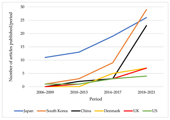 Given the geographic origin of shinrin yoku, it was not surprising to find Japan to be the earliest and foremost location of forest therapy research, with 72 articles (27.6% of the entire sample) dating back to 1998. Of the 31 countries listed as the locations of forest therapy research in our sample, Japan and five other countries accounted for two-thirds of published articles to date (Figure 2). As the Figure 2 shows, research in Japan has steadily increased over 2006–2021, while studies in South Korea (n = 43) and China (n = 29) have increased greatly in recent years. Europe as a whole has also seen a big increase in recent years, from only 1 between 2006–2013 to 15 in 2014–2017 and 37 in 2018–2021.