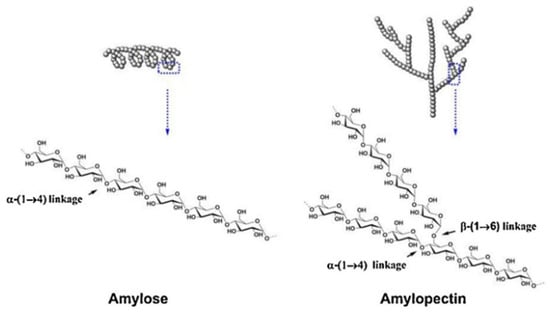 Starch is mostly derived from corn, wheat, sweet potatoes, cassava, and potatoes, while rice, barley, sorghum, and other grains are minor sources in various regions of the world [26]. About 98%–99% of the dry weight of starch composition includes amylose and amylopectin, and the rest includes a small amount of damaged starch, enzymes, lipids, proteins, ashes, minerals, and phosphorus [6,7,27].