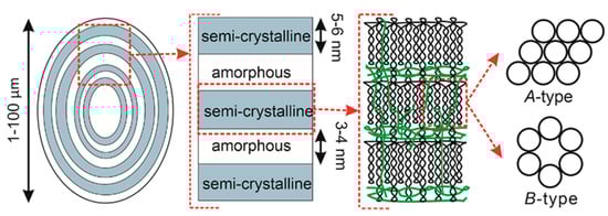 Morphologically, the starch granule is a combination of amylose and amylopectin, forming amorphous regions in semi-crystalline regions through hydrogen bonds between molecules (Figure 2) [9]. The crystalline part hinders the water or any chemical components from penetrating the starch structure and causes lower reactivity and a higher gelation temperature [9]. Therefore, some modifications to the starch crystalline part or decreasing the crystalline size has been recommended. Certain modifications have been propounded to reduce the crystallinity of starch, including chemical (esterification, oxidation, cationization, and etherification), physical (heat-moisture treatment, mechanical activation, ultrasonic degradation, and microwave exposure), and enzymatic treatment [2,10,11,12].