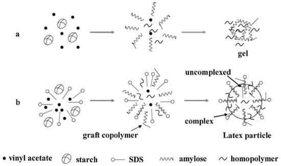 Another study described the grafting of vinyl acetate monomer onto corn starch and crosslinking polymerization, using N-methylol acrylamide to produce an environmentally friendly starch-based wood adhesive for producing wood-based composites [44,107]. The authors concluded that developing a complex network structure and greater crosslinking density was responsible for the starch-based adhesive’s improved performance.