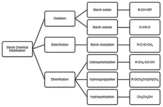 Diagram outlining the classical chemical techniques for starch modification [83]. Reprinted/adapted with permission from Ref. [83]. 2017, Elsevier, License Number 5400551069466.