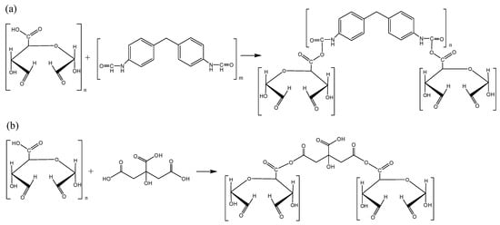 Possible cross-linking reactions of (a) B-pMDI/OS and (b) CA/OS [56].
