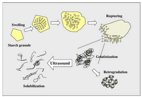 Changes in granular structure, swelling power and solubility, gelatinization transition temperature, syneresis, and pasting properties were seen after ultrasonic treatment [119,123]. As depicted in Figure 8, linear amylose was easier to attack by ultrasonic treatment than highly branching amylopectin molecules and it degraded the amorphous portions preferentially [38]. The number of modifications brought about by ultrasonic treatment varied depending on the amylose content and the crystal structure of the starch. It is also demonstrated that physical treatments made it possible to manufacture OS-CMS derivatives, utilizing the microwave or ultrasonic irradiation, reducing the time needed for esterification from the previously described conventional heating method of 24 h to only a few minutes [120].
