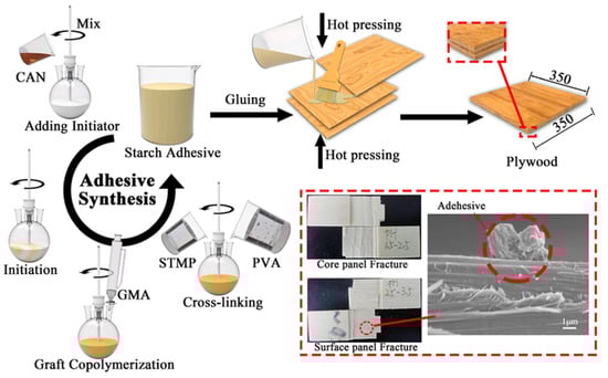 Starch-based adhesive synthesis and plywood preparation [140]. Reprinted/adapted with permission from Ref. [140]. 2022, Elsevier, License Number 5400560927363.