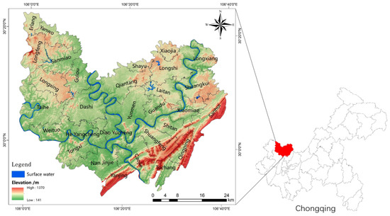 Located at 105°58′37″–106°40′37″ east and 29°51′02″–30°22′24″ north, Hechuan District measures 69 km in length east to west and 58 km in width north to south and is situated northwest of Chongqing [16]. The area includes 23 towns and seven subdistrict offices. In 2019, the urban population in Hechuan District was 1.43 million. The area covers a total of 2375.61 km2, and the construction land area is 232.55 km2, accounting for 9.92% of the total area, with approximately 7% forest land coverage.