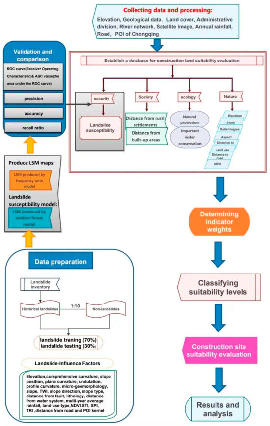As such, the Hechuan District of Chongqing was investigated, and random forest and AHP were adopted to explore the suitability of land for construction in mountainous areas from the perspective of landslide susceptibility. First, 754 historical landslide sites were sampled in the Hechuan District according to the theoretical method of landslide susceptibility assessment, and a landslide susceptibility model was established based on the RF model of Hechuan District; then, on the basis of the disaster safety model, an evaluation model of the suitability of land for construction in mountainous areas was established, considering social, ecological and economic factors.