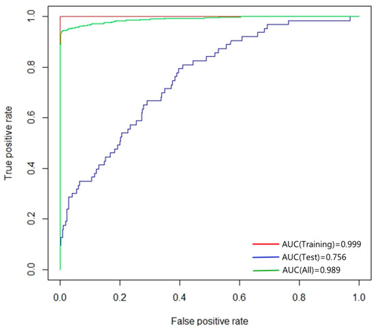 In addition, the landslide susceptibility results constructed by the RF model were assessed by means of ROC analysis. In this research, ROC curve analysis was performed in R Studio software using the R language. The AUC values for the training, test and all samples were 0.999, 0.756 and 0.989, respectively (Figure 4). The test AUC values were greater than 0.7, indicating that the model prediction accuracy was high and stable.