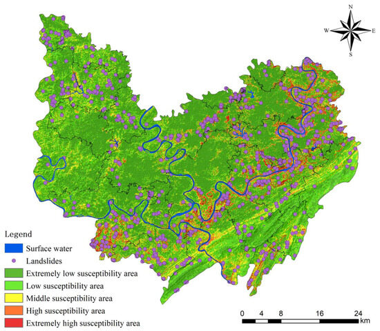 To evaluate the likelihood of landslides in the study area, a random forest model was applied to each grid in the area. The results of the random forest model were imported into ArcGIS 10.6, classified using the natural breakpoint method and adjusted according to the procedures described in prior research [8,22]. Landslide susceptibility was classified into the following five levels: extremely low, low, medium, high and extremely high susceptibility areas (Figure 5 and Table 7).