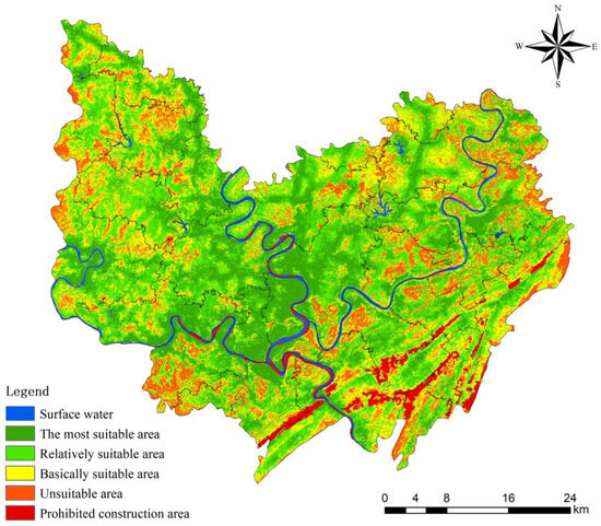 Using the ArcGIS10.6 platform, the aforementioned landslide susceptibility results and natural, social and ecological factors were superimposed and calculated according to Equation (3), with the results divided into the following zones according to the natural breakpoint method: prohibited construction, unsuitable, basically suitable, more suitable and the most suitable [2,30]. The ecological red line space was superimposed and divided into prohibited construction zones, and the final results of the suitability assessment of construction land in Hechuan District were obtained.
