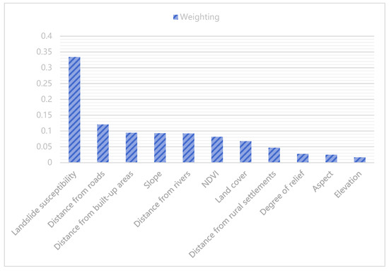 As proposed by Professor Saaty [28] (1980), the analytical hierarchy process (AHP) method, in which multiple criteria are selected to make decisions, is a simple, adaptable and practical approach to quantitatively analyze qualitative issues. The method can split a complex problem into a number of levels and factors, thereby allowing for a comparison between two indicators to be made to determine the degree of importance and to establish a judgement matrix. In the AHP method, a hierarchical relationship is established between all the elements, and the evaluation procedure is simple and easy to operate [21]. The AHP method is used to determine the weight values of the indicators, judge the importance of each factor, conduct comparative analysis and construct a judgement matrix. The expert scoring approach determines the relative significance of the evaluation indicators, and a two-by-two judgement matrix is created to compare indicators between the layers, with the consistency of the judgement matrix then checked to ensure that there is no bias in the two-by-two comparison process. Considering that the ecological factor is incorporated into the no-construction zone, only a hierarchical structure model of safety, nature and society was constructed. In the model, each evaluation factor was normalized, the relative significance of each variable was assessed, the weight values of the three categories of factors were identified using the AHP method and further judgements on the weights of various factors within the two categories of nature and society were made, whereas the weight of the safety factor was determined through the average Gini coefficient of RF. The weight values of the indicator layer for the criterion and target layers were calculated using YAAHP software [28,29]. By overlaying the weight maps of the influencing factors obtained using ArcGIS10.6 with the AHP method, a geospatial data-based model of the suitability of land for construction in mountainous areas affected by landslides is constructed. See Equation (4).