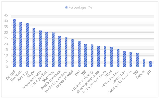The q-value of the mean Gini coefficient in the random forest explains the contribution of the factor, that is, the degree of influence of the degree factor on the landslide. The results show that the three factors of average multiyear rainfall, elevation and lithology had the greatest influence on landslides (Figure 8).