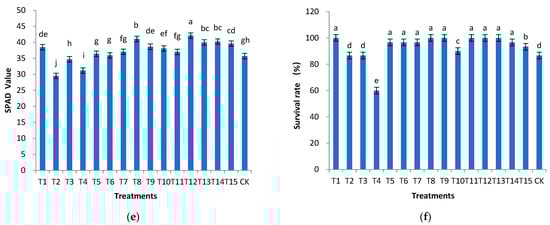 Growth characteristics and relative chlorophyll content of H. chrysanthus with different mixed substrates: (a) height (H, cm), (b) ground diameter (D, mm), (c) height–diameter ratio (H/D), (d) branch number, (e) relative chlorophyll content (SPAD value), and (f) survival rate (%). Significant differences between treatments are indicated by different lowercase letters (Tukey’s HSD test; p < 0.05; mean ± SE).