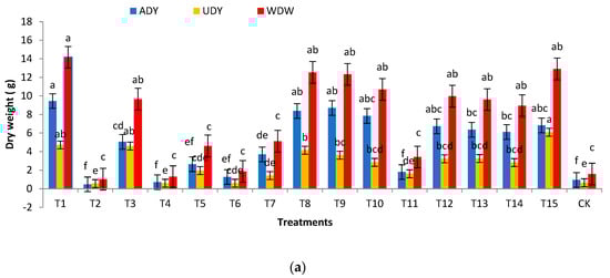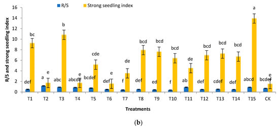 Biomass is an important index that reflects the material accumulation of seedlings. The variance analysis of biomass indexes such as the dry weight (aboveground, underground, and whole plant) of seedlings in various treatments showed that the difference in each index of different substrates was significant (p < 0.01; Figure 2), indicating that a different substrate had a significant impact on the quality of seedlings. Treatments T1, T15, T8, T9, and T3 ranked the highest in terms of the whole-plant dry-weight index, and their values were 14.17, 12.91, 12.54, 12.33, and 9.66 g, respectively (Figure 2a). Figure 2b shows that the R/S values of T2, T3, T11, and T15 were high. T15, T3, T1, T8, and T9 had a high seedling index and quality.