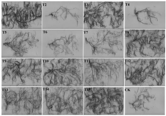 As shown in Figure 3, different substrates had a significant impact on the seedling root. Treatments T1, T3, T8, T9, T10, T12, and T15 showed relatively developed roots, while T2, T4, T6, and CK yielded poor root growth. The results of the ANOVA showed that there were some differences in various indices of seedling roots of different substrates (Table 4). The total root length of T1 was the highest, followed by T15, T3, and T10, which had significantly higher root lengths compared to other treatments. Root projection and total root-surface areas were the highest in T15, followed by T3, T1, and T10. The root length per cubic centimeter of soil was the highest in T1, followed by T15, T3, and T10. Total root volume and total apical number were the highest for T15, followed by T3 and T10. In conclusion, the roots of T15 were the most developed, followed by those of T1, T3, and T10.