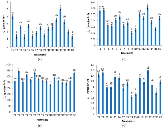 Different substrate ratios had significant effects on photosynthetic parameters, such as Pn, Gs, Ci, and Tr, (Figure 4). The Pn of T13 was the highest, followed by T1, T12, and T14, with values of 5.034, 4.023, 3.573, and 3.341 μmol m−2·s−1, respectively, and the lowest was T4, followed by T2, CK, and T6, with values of 1.343, 1.371, 1.384, and 1.397 μmol m−2·s−1, respectively (Figure 4a). The Gs of T13 was the highest, followed by that of T2 and T1, at 0.060, 0.056, and 0.056 mmol m−2·s−1, respectively (Figure 4b). The Ci was the highest in T2, T6, and CK, and it was the lowest was T10, T14, T13, and T3 (Figure 4c). The Tr of T13 was the highest at 1.602 mmol m−2·s−1, followed by that of T2 and T1, which were 1.523 and 1.445 mmol m−2·s−1, respectively (Figure 4d). In short, the photosynthetic capacities of T13 and T1 were the strongest, while those of T2, T6, and CK were the weakest.