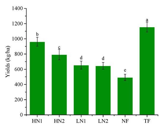 Yields with different N supplies. The statistical approach used was LSD (least significant difference) analysis. Every group contains 3 tea leaf samples. Different lower-case letters above the bars indicate significant differences among treatments (p < 0.05).