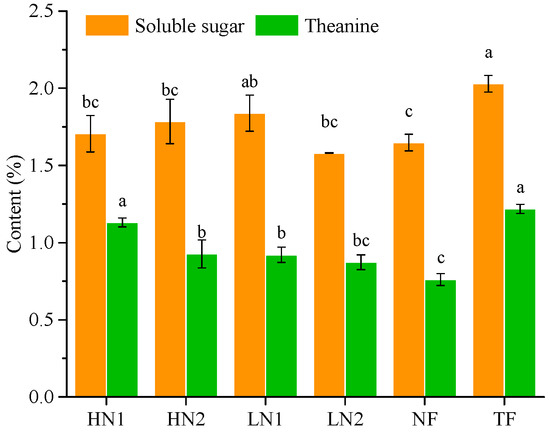 The contents of soluble sugar and theanine in tea shoots. The statistical approach used was LSD analysis. Every group contains 3 tea leaf samples. Different lower-case letters above bars indicate significant differences among treatments (p < 0.05).