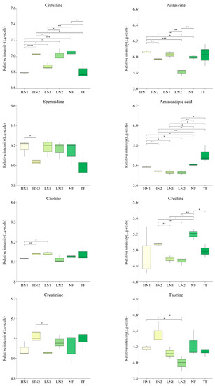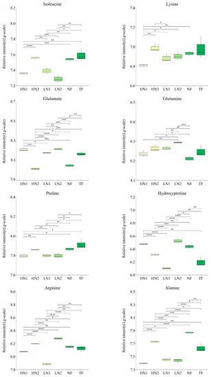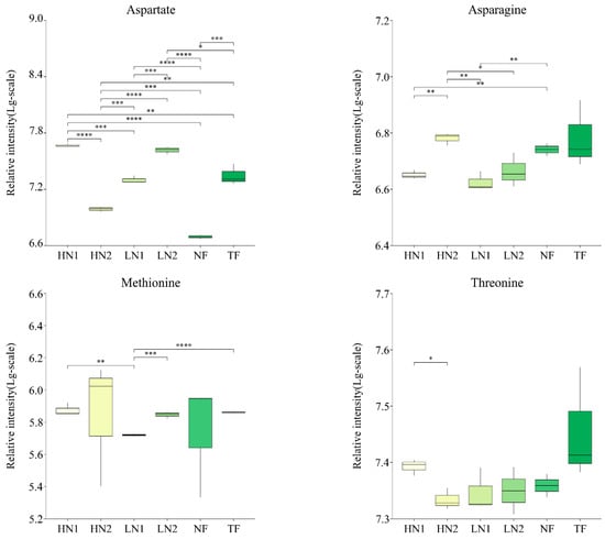 Analyses of the differences in the accumulation of 28 kinds of amino acid components in tea shoots under different nitrogen supply conditions are shown in Figure 3. Compared to TF, the expression levels of alanine, phenylalanine, citrulline, creatine, and hydroxyproline in non-fertilized tea gardens (NF) were significantly increased, while the expressions of glutamate and aspartate were significantly decreased. Compared to no fertilization (NF), the application of inorganic nitrogen at 300 kg/ha and 150 kg/ha (named HN1 and LN1) was up-regulated in terms of the expressions of aspartate, glutamate, glutamine, and putrescine, while a total of 16 amino acids, alanine, phenylalanine, tyrosine, aminoadipic acid, arginine, hydroxyproline, proline, leucine, isoleucine, valine, asparagine, citrulline, glycine, lysine, creatine, and ornithine, were down-regulated. In contrast, with the organic–inorganic mixed application of N 300 kg/ha (HN2), compared to HN1 and LN1, most of the up-regulated amino acids in the above-mentioned HN1 and LN1 were down-regulated, and most of the down-regulated amino acids were up-regulated. It was shown that HN2 has less effect on amino acid accumulation patterns in N-starved tea plants. On the other hand, all nitrogen fertilization treatments in long-term unfertilized tea gardens promoted the accumulation of aspartate, glutamate, or glutamine, indicating that nitrogen fertilization has activated the uptake and utilization of nitrogen in soil by tea plants.
