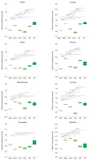 Changes of amino acids accumulation in tea leaves with different N supply. In total, 30 kinds of amino acid components were detected, and this figure shows only those with significant differences. The statistical approach used was a two-tailed t-test. Every group contains 3 tea leaf samples. ****, ***, **, * indicates a significant difference at p < 0.0001, p < 0.001, p < 0.01, and p < 0.05, respectively.
