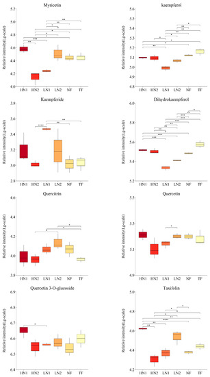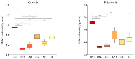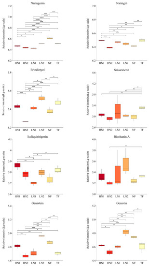 As shown in Figure 4, the abundance of the 26 flavonoids detected showed significant differences among the different nitrogen fertilization treatments. Non-fertilized (NF) leaves promoted the accumulation of epigallocatechin (EGC), vitexin, apigenin, chrysin, genistein, genistin, and naringenin, while they inhibited the accumulation of sakuranetin, eriodictyol, naringin, and dihydrokaempferol. When organic nitrogen or inorganic nitrogen were applied at 150 kg/ha, LN1 and LN2 showed significant differences in 11 and 5 flavonoids compared to NF, of which 9 and 4 flavonoids were downregulated. Meanwhile, the abundance of 12 kinds of flavonoid components was significantly different in LN1 than in LN2, all of which were downregulated. It was indicated that nitrogen absorption inhibited the synthesis of flavonoids in N-starved tea plants with a small amount of N application. Compared to the application of organic–inorganic-mixed N 300 kg/ha (HN2) and inorganic N 150 kg/ha (LN1), there were significant differences in the cumulative amounts of 16 and 14 flavonoid components in the application of inorganic N 300 kg/ha (HN1), respectively, among which 14 and 12 were up-regulated. The accumulation of 9 flavonoid components (catechin, epicatechin, gallocatechin, dihydrokaempferol, rutin, myricetin, taxifolin, naringin, and isoliquiritigenin) in HN1 was also significantly higher than that in NF, indicating that the high inorganic N supply promoted the synthesis of flavonoids in N-starved tea plants. It is worth noting that the total amount of N applied in HN2 was equal to that in HN1, but the accumulation of 10 flavonoids in HN2 was downregulated compared to NF, showing closer effects on flavonoids with LN1. These analyses indicate that the amount of available nitrogen was the main factor causing differences in the accumulation of flavonoids in this study.