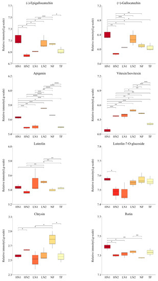 In addition, the accumulations of 6 flavonoid ingredients (namely, catechin, epicatechin, gallocatechin, apigenin, taxifolin, and genistein) in HN1 were significantly higher than those in TF, while vitexin, kaempferol, naringenin, and sakuranetin showed higher levels in TF, indicating differences in response to the nitrogen nutrient of flavonoid metabolism between a N-starved tea plant and N-sufficient tea plant.