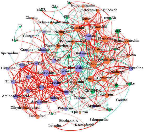 The correlation network analysis among amino acids, flavonoids, and phytohormones. |r| > 0.5, p < 0.05. The colors of the nodes represent the categories of metabolite and the size of nodes relates to the quantity of the corresponding metabolite; the red line means a positive correlation and the green line means a negative correlation. The wider the line, the more significant the correlation.