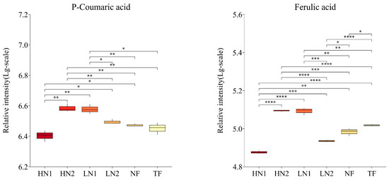 The changes in ferulic acid and p-coumaric acid contents in tea leaves with different N supplies. The statistical approach used was a two-tailed t-test. Every group contains 3 tea leaf samples. ****, ***, **, * indicates a significant difference at p < 0.0001, p < 0.001, p < 0.01, and p < 0.05, respectively.