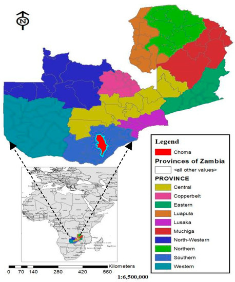 The study was conducted in Choma District, located in the Southern Province of Zambia, approximately within 26°30′–27°30′ E and 16°–17°45′ N, south of the equator on the plateau of Southern Zambia, and its land area is 7296 square kilometers (