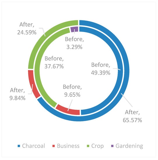 Figure 5). After the FFF program was implemented, charcoal contributed 65.57% of household income, crops contributed 24.59%, and business contributed 9.84% (