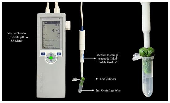 One part of the fresh samples was measured with the non-grinding puncturing method (Figure 1): take 3–8 leaves and overlap them top to bottom, curl the leaves into a cylinder and fold the cylinder in half along the middle of it, avoiding the main vein. Insert the folded leaf cylinder into a 2 mL centrifuge tube and make sure the thickest protruding part of the folded leaf cylinder is upward. Cut a small opening at the thickest protruding part of the leaf cylinder, insert the needle-punched pH electrode into it, ensure the electrode is completely and tightly wrapped by leaves, and record the stable pH value (Experimental photographs, see Figure 1). Leaf pH was measured by a pH meter (Mettler-Toledo portable pH S8-Meter) with a precise pH electrode (Mettler-Toledo pH electrode InLab Solids Go-ISM), which was calibrated against buffer solutions (pH 4.00, 7.00 and 9.18) before measurement.