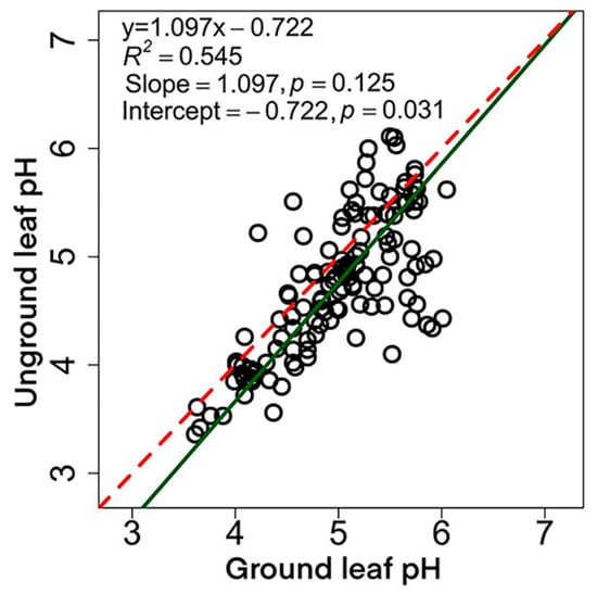 Ground leaf pH was significantly higher than unground leaf pH (4.99 vs. 4.75; p < 0.01) (Table 1). We found significant positive correlation between ground leaf pH and unground leaf pH (R2 = 0.545, p < 0.001) (Figure 2). The SMA regression fitting results showed no significant difference between the fitting slope and 1 (p = 0.125). However, the regression intercept was significantly less than 0 (p = 0.031), which means grinding does have a fixed effect (increased) on measured leaf pH. The conversion equation between the two methods was: y = 1.097x − 0.722.