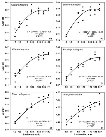 Relationship between leaf–water ratio and leaf pH. Dried leaf samples of (a) Cedrus deodara, (b) Viburnum opulus, (c) Rosa cathayensis, (d) Lonicera maackii, (e) Buddleja lindleyana, and (f) Amygdalus triloba were used here. See Materials and Methods for details.