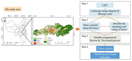 Management of forest landscapes is typically predicated upon knowledge of the biophysical system, with limited attention directed towards understanding the natural and social dimensions between these intertwined systems [1,2]. Values, especially relational values, should be considered an important dynamic in the coupling of ecological and social systems [3]. Relational values offer a way to transcend the dichotomous thinking about intrinsic and instrumental values that have guided much sustainable management and utilization of the forest landscape [4,5]. The intrinsic and instrumental values of landscapes have attracted increasing public attention in China [6]. Under the guidance of the national forestry development philosophy of ‘Clear waters and green mountains are as good as mountains of gold and silver’ [7], the utilization of forests has transformed from a production space to a tourism consumption space and further to a strategic space for the supply of the ecological public goods of forests [8]. Typology of forest landscapes has been considered the synthesis of the intrinsic and instrumental values of forest landscapes perceived by the individual [9,10]. Therefore, a study on the typology of forest landscapes through individual perception would not only present the preference, meaning, and values of forest landscapes in a certain way [11] but also be regarded as the premise for people to understand and experience the forest landscape [12].
