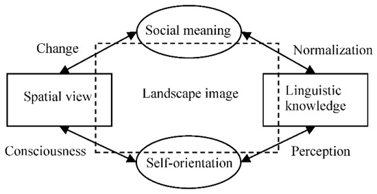 The formation of forest landscape images is a complex process [60,61]. Firstly, the orientation of the body-subject is anchored by the combination of the landscape elements and whether the subject stated the standpoint in the sketches. Secondly, the subject depicts the forests by graphics, vocabulary, and language by interpreting the processing of forest landscape element information in the subject’s mind, then a representation composed of linguistic elements is formulated, namely linguistic knowledge. In addition, by integrating the processing of sense information (consciousness) of landscape elements and the individual’s experience (experience) of the forest, the subject describes their viewing angle and distance from which they capture the special landscape by shape, size, and combination of forest landscape elements, namely spatial view. Thirdly, linguistic knowledge and spatial view are further normalized and changed through experience and communication among a certain social group, then formulated into a collective and normative way of seeing the landscape, namely social meaning. Finally, social meaning also reacts to language knowledge, spatial view, and adjusted self-orientation. In this study, the landscape image diagram is built according to the reaction among self-orientation, linguistic knowledge, spatial view, and social meaning (see Figure 2). This diagram includes the spatial and semiotic aspects of landscape (spatial view and linguistic knowledge) along with the individual and social aspects (self-orientation and social meaning). The consciousness, change, perception, and normalization were explored as the interactive structure and the path among these four elements.