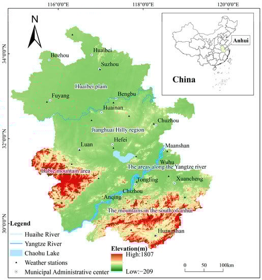- Yao, Z.H.; Wu, D.W.; Chu, R.H.; Yao, Y.Q.; He, B.F.; Huang, Y. Dynamic change of vegetation cover and its response to topography in Anhui Province. Bull. Soil Water Conserv. 2021, 41, 283–290. [Google Scholar]