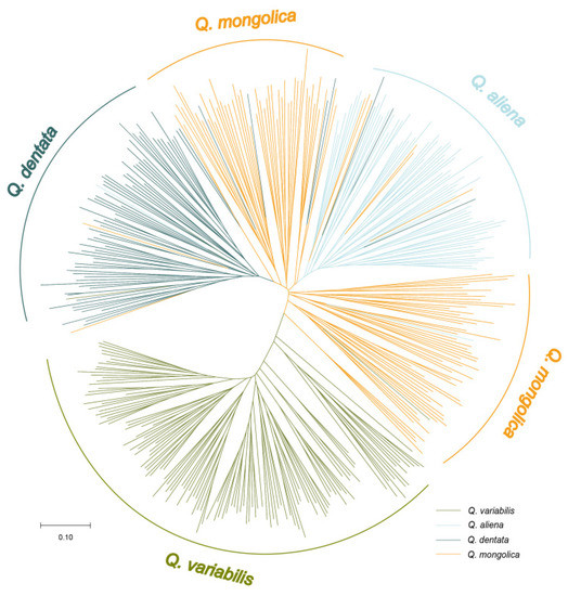 A neighbor-joining tree was conducted to show the genetic relationship among all the observed individuals. Most of the individuals of Q. variabilis had the longest genetic distance with the other three species. Notably, a few individuals of Q. variabilis were grouped with Q. dentata and Q. mongolica (Figure 1), indicating that possible gene introgression happened among species. Meanwhile, Q. dentata, Q. aliena, and Q. mongolica had more individuals grouped with each other, which suggested that gene introgression happened more frequently among these three species, confirming that these three species had a closer relationship as compared to Q. variabilis.