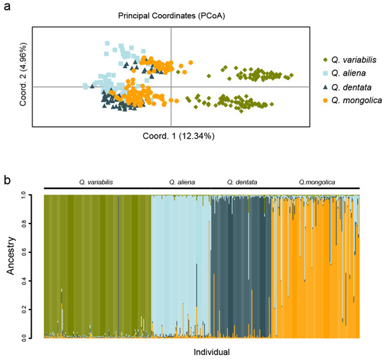 PCoA and population structure for all the 400 individuals. (a) PCoA groups of four oak species are calculated and plotted by GenAlEx6.5. Different colors indicate different species, and each point represents an individual. (b) Population structure based on Bayesian clustering approaches with K = 4 by STRUCTURE software. Each bar represents a single individual and different colors indicate different subpopulations. The individual species are shown at the top of the bars.