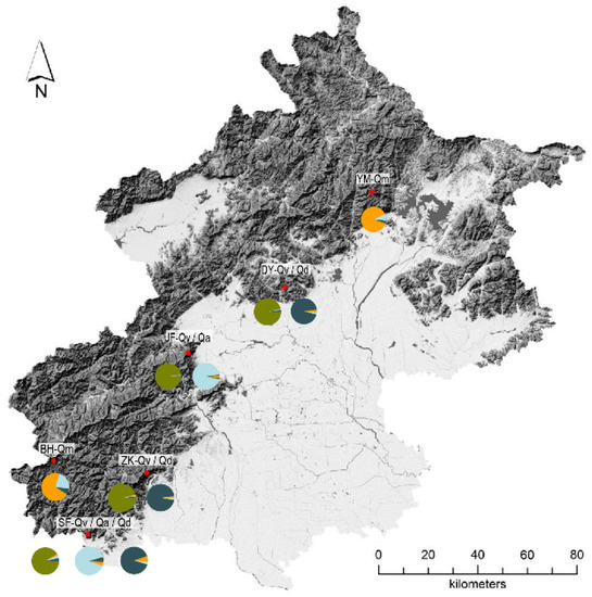 - Gao, J.P.; Qin, L.; Cao, Q.Q.; Fang, K.F.; Tian, Y.L. Genetic structure of populations and introgression of three Quercus species in mountainous area of Beijing. J. Beijing For. Univ. 2020, 42, 58–67. [Google Scholar] [CrossRef]