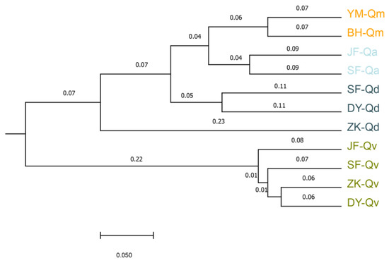 We then used the unweighted pair-group method and the arithmetic (UPGMA) algorithm to build the phylogenetic tree of populations of four species from different regions in the Beijing area. Populations from one species were grouped together and Q. mongolica had a closer genetic relationship with Q. aliena than that with Q. dentata (Figure 4). Notably, JF-Qv population, which was an artificial population, had a further genetic distance with other three Q. variabilis populations, indicating that the individuals might be transplanted from another area outside Beijing.