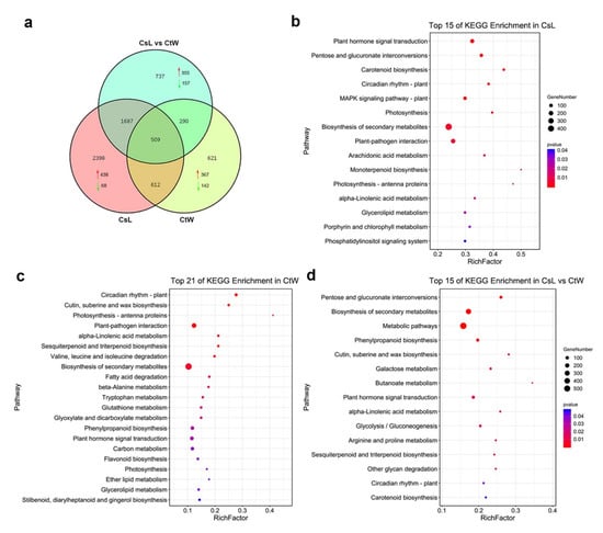 Venn diagram and significantly enriched KEGG pathways of differently expressed genes (DEGs) under freezing treatment. (a) Venn diagram showing the shared and specific number of up-regulated and down-regulated DEGs identified in CtW, CsL, and CtW vs. CsL. CtW: cold-tolerant ‘Weixuan 1’; CsL: cold-sensitive ‘Longwangmao’. (b,c) Significantly enriched KEGG pathways of DEGs in CtW (b), CsL (c), and CtW vs. CsL (d).
