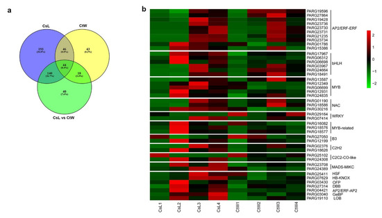 Analysis of differently expressed transcription factors (TFs) under freezing treatment. (a) Venn diagram showing the shared and specific number (and ratio) of differently expressed TFs identified in CtW, CsL, and CtW vs. CsL. (b) Heatmap of overlapping TFs between CtW, CsL, and CtW vs. CsL. Each column represents the gene expression at different temperatures (20 °C, −2 °C, −3 °C, and −4 °C) in CtW and CsL.