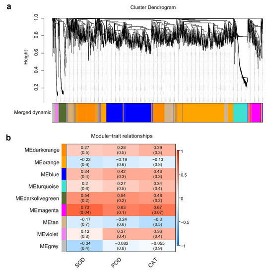 WGCNA of DEGs and antioxidant enzyme activity. (a) Cluster dendrogram presents nine co-expression modules labeled with different colors. (b) Correlation heatmap between DEGs and antioxidant enzyme activity. Rows correspond to modules. The color (from blue to red) indicates the correlation value (from −1 to 1).