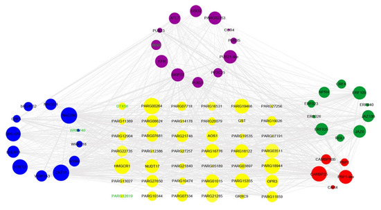 The co-expression network of hub genes in the magenta module. Red nodes refer to Ca2+-related genes; green nodes refer to genes involved in hormone signaling; purple nodes refer to genes involved in post-translational modification; blue nodes refer to TFs. Black words indicate up-regulated genes; green words indicate down-regulated genes. The size of the nodes is based on intra-modular connectivity (kME). The width of the edges is based on weight.