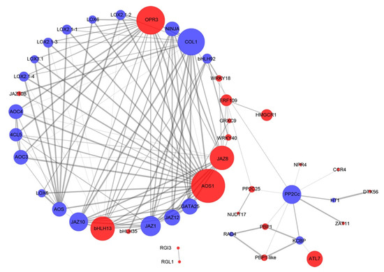 A PPI regulatory network of 81 hub genes in the magenta module was constructed to explain the potential regulatory mechanism in apricot kernels responding to freezing stress. As shown in Figure 5, JAZ8 has a direct relationship with bHLH13, WRKY18/40, ERF109, and GATA25, and especially with bHLH13, in addition to the genes in the JA signal pathways (JAZ1/10/12, NINJA, and COI1) and the JA biosynthesis genes (OPR3, AOC3/4, and AOS). bHLH13 plausibly interacts with the JA-related genes (JAZ1/8/10, NINJA, COL1, OPR3, and AOS1), GATA25, and bHLH92, whereas bHLH35 may only interact with JAZ1 and bHLH92. There may also be interactions between ERF109 and WRKY18/40, HMGCR1, GRXC9, and PP2C25. Moreover, WRKY18/40 and bHLH92, GRXC9 and JAZ12, and RGI3 and RGL1 were found to have direct relationships. PP2C25, NPR4, CCR4, ZAT11, and PBP1 were all related to PP2Cc. The JA-related genes (JAZ8, AOS1, and OPR3) and bHLH13 were considered to be key genes in the network, suggesting that they may play an important role in the ROS-mediated freezing response.