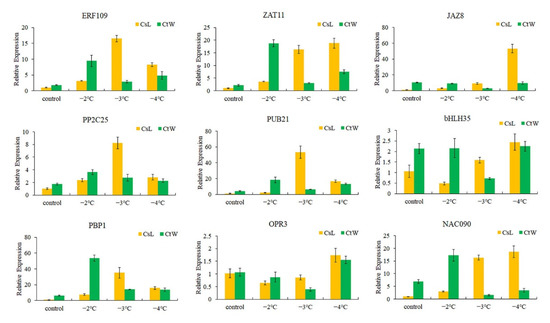 We selected nine key genes in the magenta module for qRT-PCR analysis to verify the expression pattern’s accuracy for these hub genes in the transcriptome data. With the exception of NAC090 in CtW3 and CtW4, the expression levels of ERF109, ZAT11, PBP1, NAC090, PP2C25, and PUB21 were higher under lower temperatures, higher in CsL3 or CsL4 in ‘Longwangmao’, and higher in CtW2 in ‘Weixuan 1’ (Figure 6). JAZ8 was induced by freezing stress in CsL, whereas it had no significant change or decrease in CtW. In addition, the expression levels of bHLH35 and OPR3 obviously increased in CsL4 in ‘Longwangmao’ and decreased in CtW3 in ‘Weixuan 1’. The qRT-PCR results were consistent with the RNA-Seq results, indicating the reliability of the RNA-Seq data.