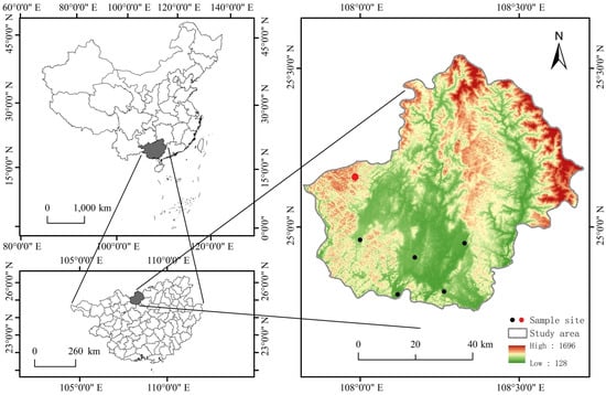 Map of the study area and locations of sample sites. The two maps on the left indicate China and Guangxi Province, and the map on the right indicates Huanjiang County. In the key, high/low indicates altitude (m a.s.l.). The black dot indicates the location of the farmland sample site. The red dot indicates the location of the forest sample site. In each sample site, five land-use types (cropland, sugarcane, mulberry, forage grass, and mature forest) were selected.